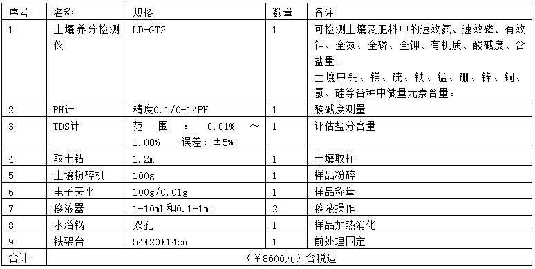 概述: 土壤檢測實(shí)驗(yàn)室配套儀器設(shè)備方案需要根據(jù)實(shí)驗(yàn)室的具體需求、預(yù)算以及檢測目標(biāo)進(jìn)行定制。以下是一個(gè)基礎(chǔ)的、全面的土壤檢測實(shí)驗(yàn)室配套儀器設(shè)備方案,可應(yīng)用于大種植戶、種植基地、農(nóng)資商、農(nóng)技服務(wù)公司等,供您參考:序號(hào)名稱規(guī)格數(shù)量備注1土壤養(yǎng)分檢測儀LD-GT21可檢測土壤及肥料中的速效氮、速效磷、有效鉀、全氮、全磷、全